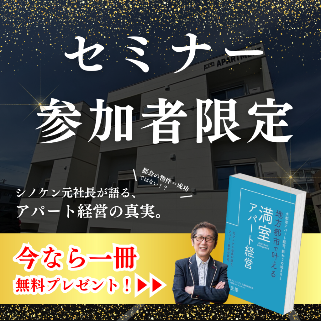 投資用アパート企画販売で有名なシノケン社の元社長、辻氏が書き下ろした 「地方都市で叶える満室アパート経営」を一冊プレゼント!