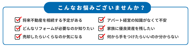 そんな思いで、土地活用や不動産購入をした方は多いのではないでしょうか。しかし「もう対策は万全」「資産はあるから」と安心していると、足元をすくわれるおそれがあります。今のご自身の状況に照らして課題を解決し、優良な資産づくりをしていくためには、資産全体を定期的に見直すことが肝要です。