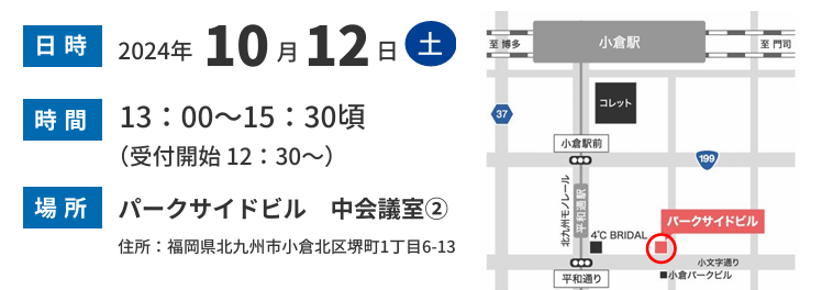 開催場所:パークサイドビル 中会議室② 福岡県北九州市小倉北区堺町1丁目6-13 MAP