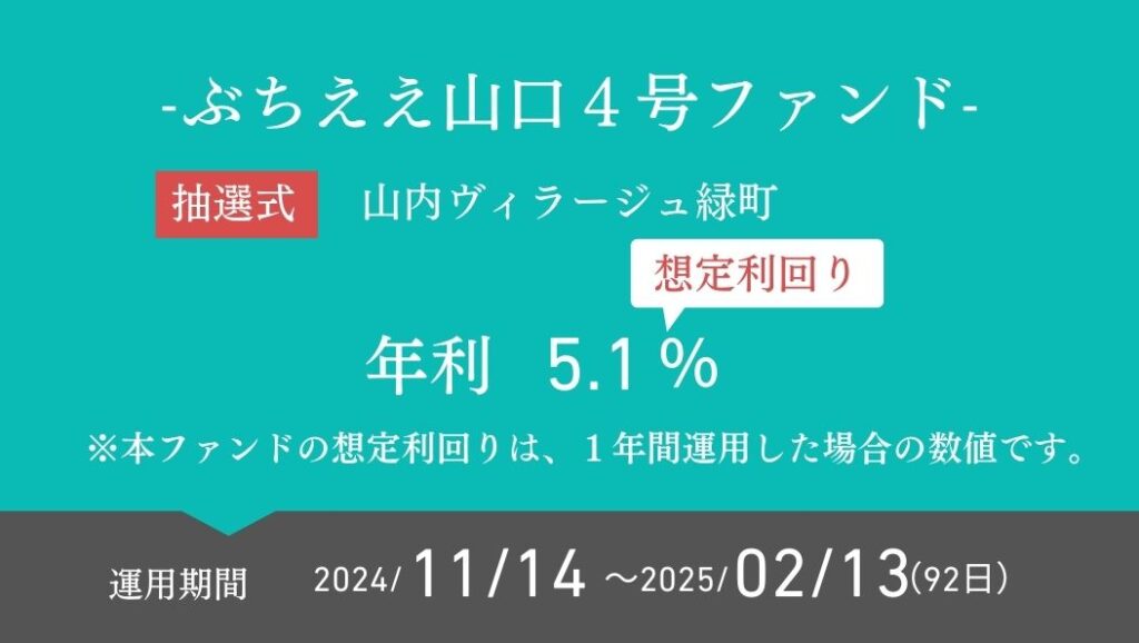 弊社が提供する田村ビルズクラウドファンディングの不動産小口化商品「ぶちええ山口4号ファンド」を抽選式で10月21日(月)より募集開始いたしました。本ファンドの投資対象は山口県山口市緑町にある分譲マンションです。対象不動産はすでに弊社が所有し、安定した賃貸運営をしています。その賃料収入を配当資源として投資家の皆さまへ分配する予定です。
