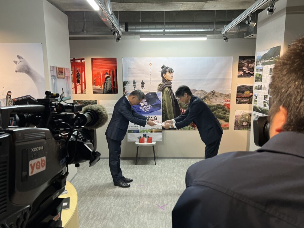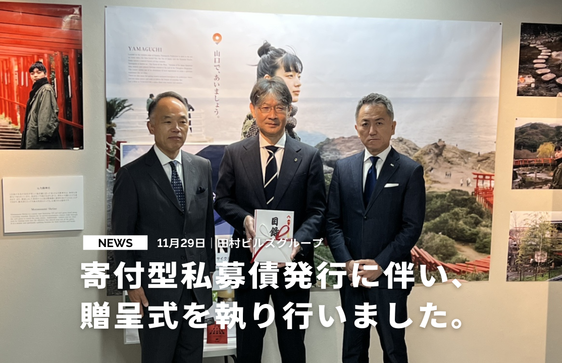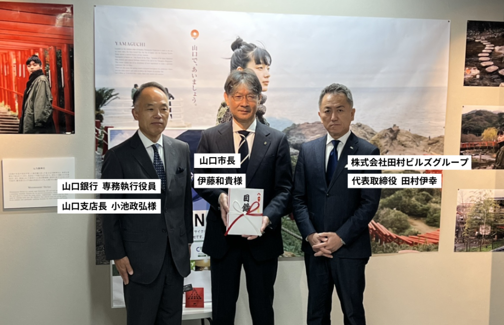 ⽥村ビルズグループは「⼭⼝銀⾏保証付寄付型私募債」発⾏に伴い、11月29日に贈呈式を執り行いました。