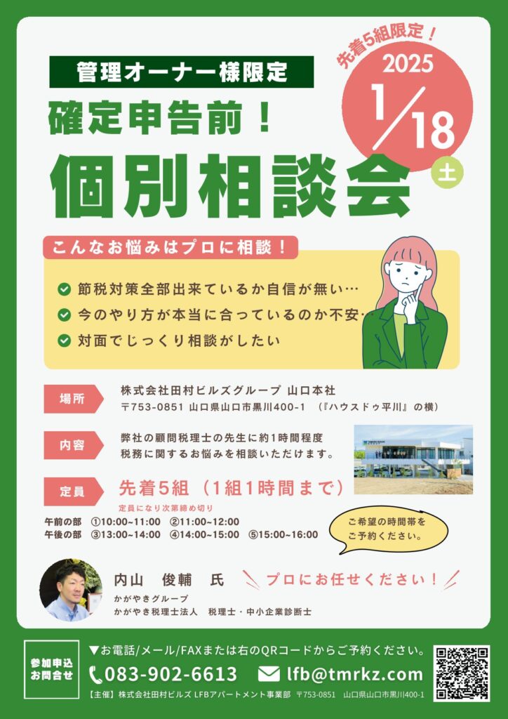 何かと不安な確定申告前… 管理オーナーさまを対象に、「税務個別相談会」を開催させていただきます。
