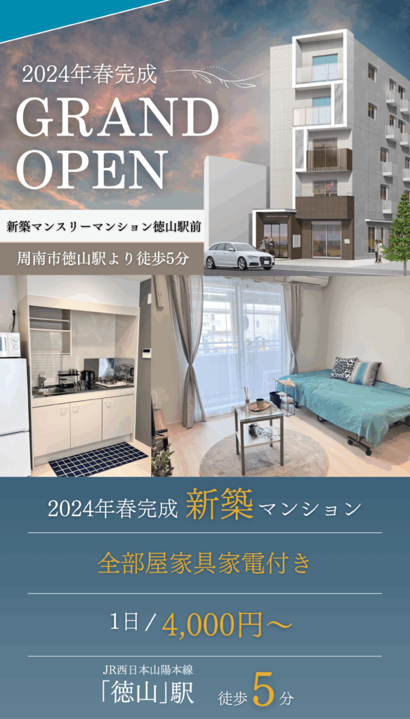 2024年春に完成した新築マンスリーマンション「LFB STAY徳山駅前」。