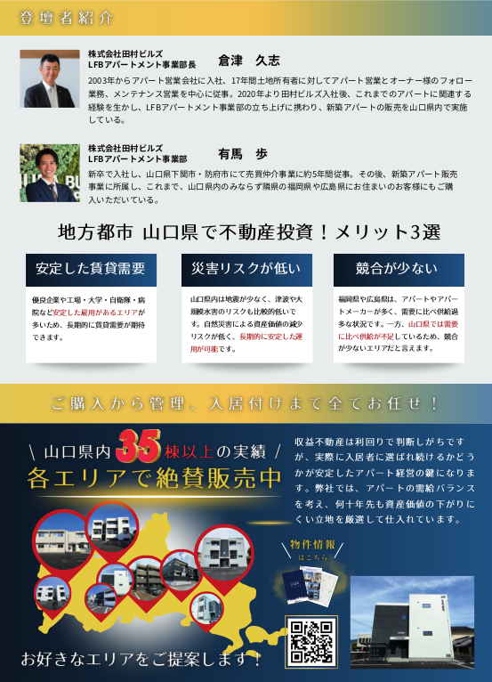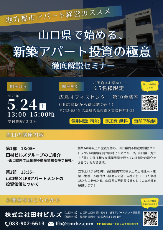 今回のセミナーでは、山口県の不動産投資としての立地性やLFB APARTMENTのご紹介なども詳しくお話させていただきます!