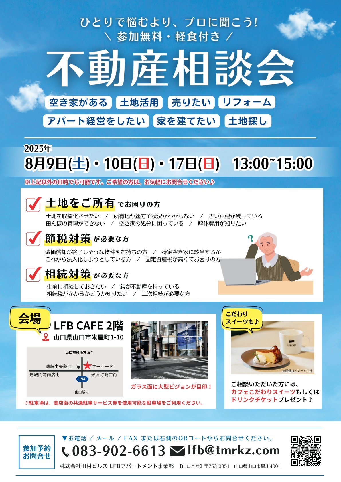 山口市の中心商店街の一角、弊社が運営する「LFB CAFE」にて、不動産相談会を開催いたします!