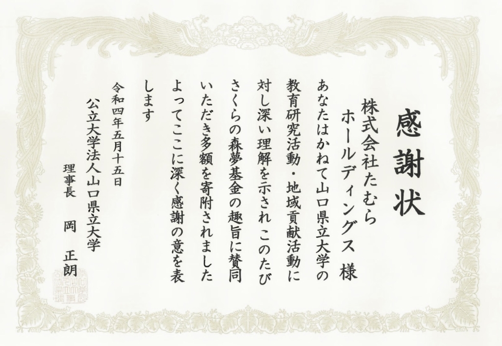 この度、株式会社たむらホールディングスは、学生の修学支援、地域貢献、特色ある教育研究の支援など、財政基盤の強化を目的とする「山口県立大学さくらの森夢基金」への寄付を実施いたしました。