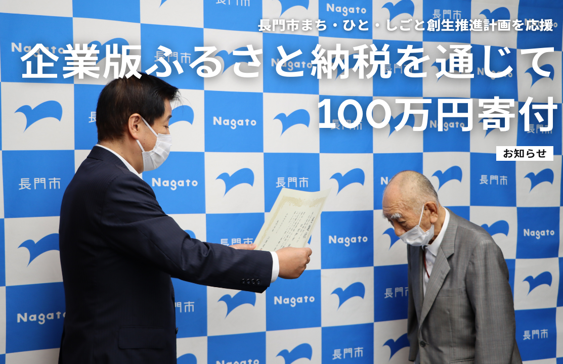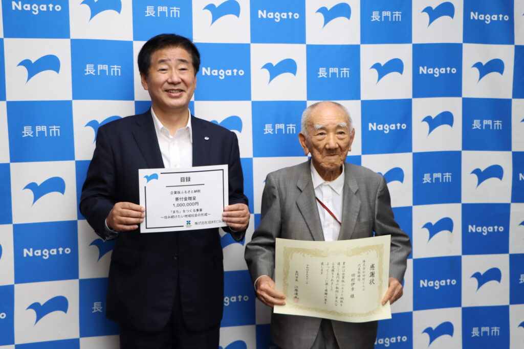 株式会社田村ビルズでは、山口県長門市が推進する「長門市まち・ひと・しごと創生推進計画」を応援するため、企業版ふるさと納税を通じて100万円の寄付をさせていただきました。
