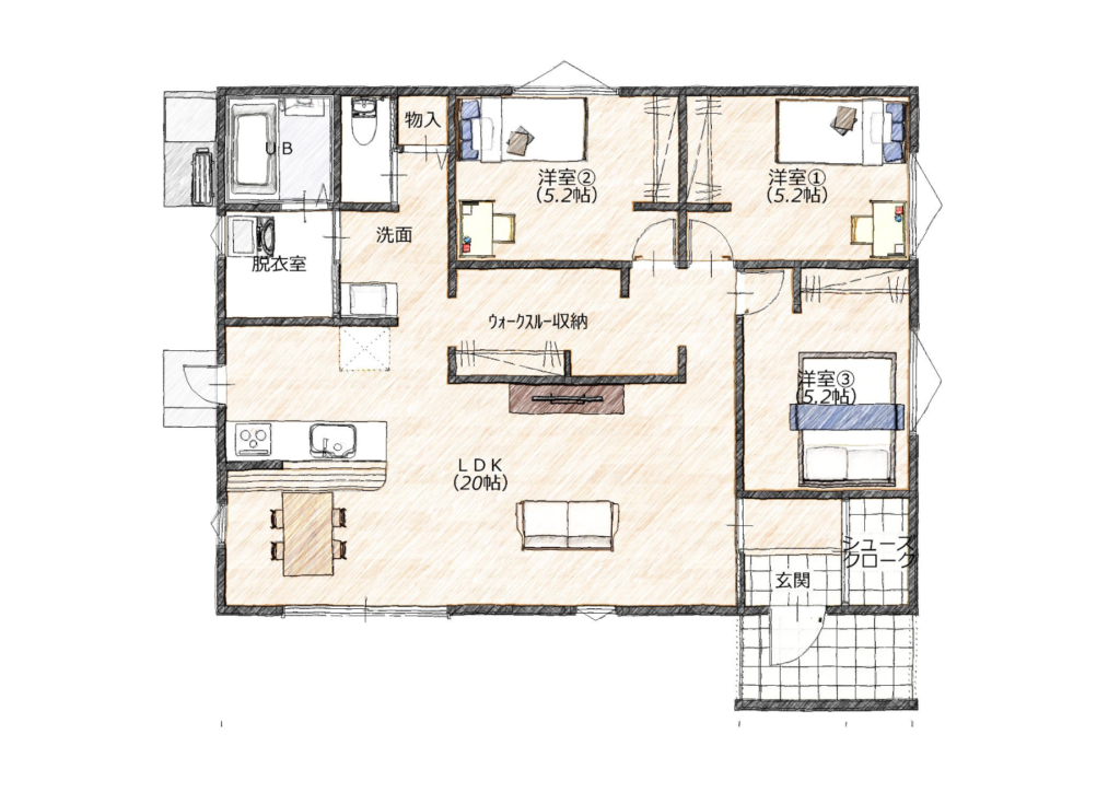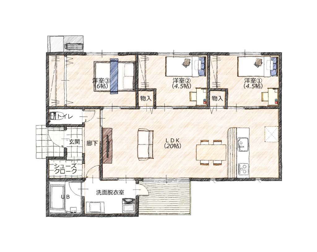 この間取りのポイントは洗面脱衣室にリビング、廊下、デッキの3か所から入ることのできる導線を確保しているところです!洗濯物を干したり、汚れて帰宅してもすぐに洗い場に行くことができるようになっています。