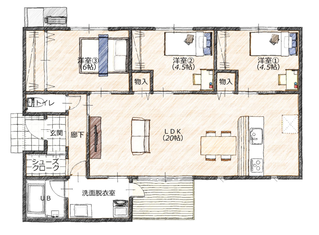 平屋特有の窮屈さがなく、生活しやすい間取りとなっています。