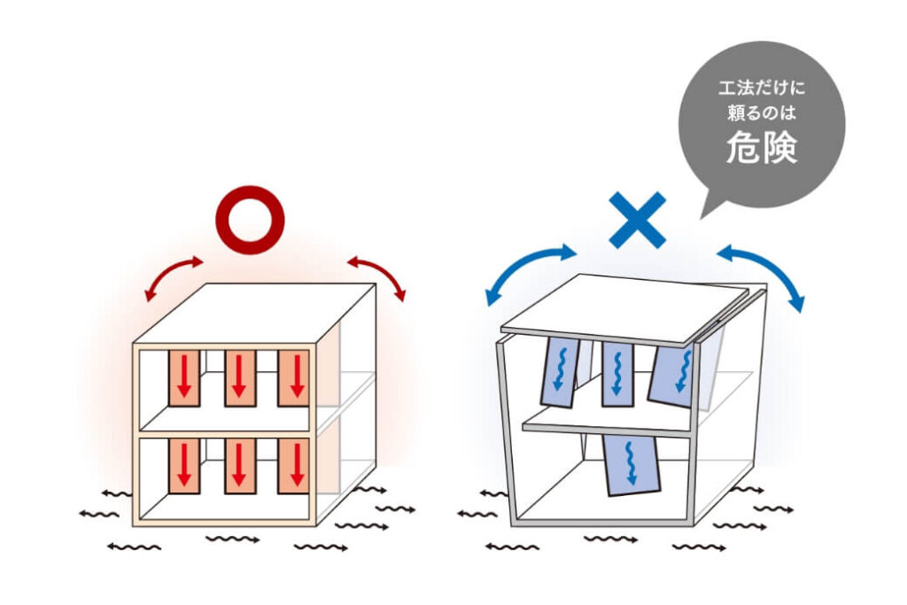 ④の大地震に耐えられる高い耐震性。LFBの家づくりは耐震性をより重視しています。