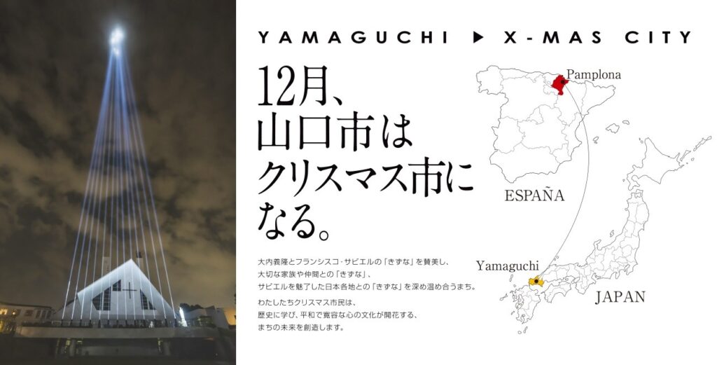 今年の12月25日クリスマスは、日曜日です。クリスマスを家族でゆっくりされる方も多いのではないでしょうか。私も家ではサンタクロー…(夢を壊さないように以下略)。山口でも様々、クリスマスを感じさせるイベントが各所で開催されているようです。ぜひこの機会にご紹介したいと思っているところなのですが、実は『日本で最初にクリスマスが祝われたのが山口市』だと、皆さんご存知でしょうか。今回は、「歴史からみる山口市」と題して、クリスマスについてお話します。オススメのイベントやイルミネーションスポットもご紹介させていただきます。