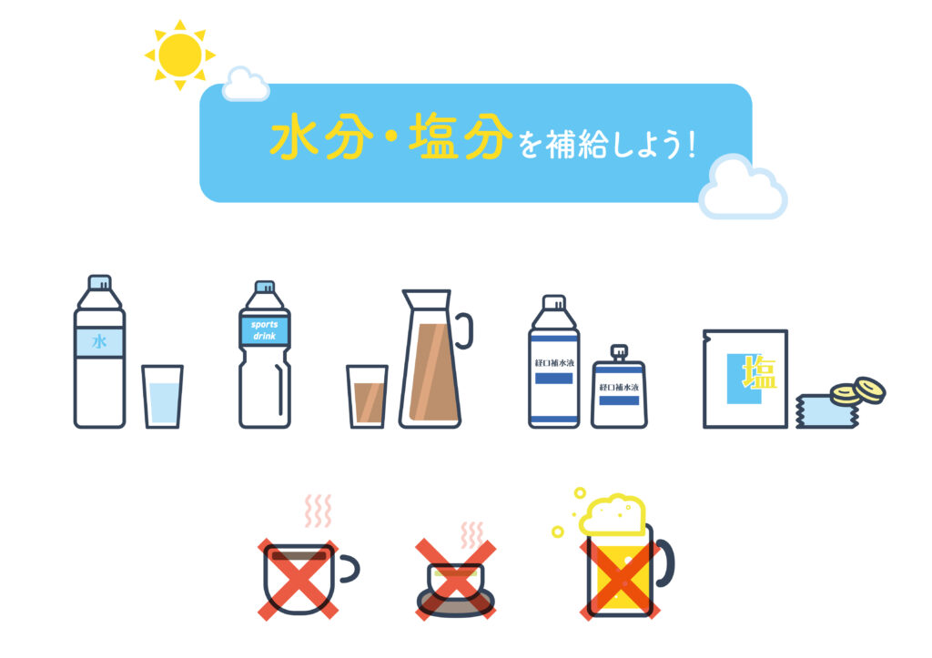 1時間に1回、コップ1杯を目安に。スポーツドリンクや塩分補給も忘れずに。