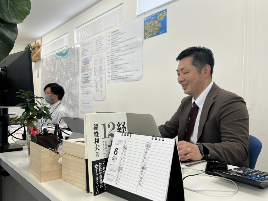 「30代の頃、飲食店を3店舗経営していました。朝の4時から夜の12時まで働くような生活がほぼ毎日続いていて、すごく働いていたにも関わらず儲かりませんでした。家族に説得はされていましたが、決め手になったのは妻に『他にやりたいことはないの?』と言われたことで転職を考えました。元々飲食店の前は土地仕入れの仕事を2年ほどやっていたこともあって、不動産の仲介業をしてみたいと思いました。面接を受けていく中で、大手企業からも内定をいただいておりましたが、田村ビルズの河村さん、大塚さんに心を動かされました。正直に言ってしまうと、内定をもらっていた他企業に比べ、給与が低く、熊本から出たことのない私に『山口に来てくれないか。』と提案されました。とても悩みましたが、人にフォーカスした面接で一人一人に向き合ってくれる社風に心惹かれ、『この会社で働きたい!』と感じたことがきっかけです。」